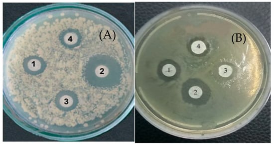 Figure 5. Influence of catalase on antimicrobial activity of LysO against catalase-negative bacteria. (A)—E. durans VKM B-603; (B)—P. aureofaciens VKM B-1249. 1—LysO (1 U); 2—LysO (1 U) + L-lysine (10 μM); 3—LysO (1 U) + L-lysine (10 μM) + catalase (10 μg); 4—LysO (1 U) + catalase (10 μg).