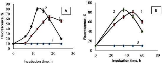 Figure 6. ROS generation in the cells S. epidermidis (A) and R. solani (B) in the presence of LysO. 1—5 μg/mL, 2—10 μg/mL, 3—0 μg/mL.