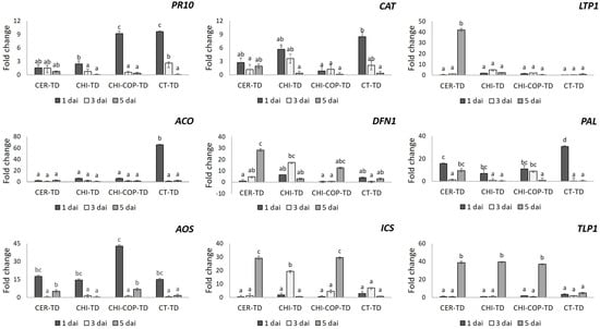 The relative expression patterns of nine key defence-related genes assessed by quantitative real-time PCR in comparison to a peach housekeeping gene (elongation factor 1-alpha). The relative fold change (2−△△CT) values of T. deformans (TD)-inoculated leaf samples pre-treated with cerevisane (CER-TD), chitosan hydrochloride (CHI-TD), chitosan in combination with copper hydroxide solution (CHI-COP-TD), and untreated (CT-TD) samples were compared to mock-inoculated and untreated (CT) samples. Expression levels are represented as mean values from three independent biological replicates on days 1, 3, and 5 after inoculation (dai). Different letters indicate statistical differences between treatments across all time points after one-way ANOVA analysis and Tukey test for multiple comparisons (p < 0.05).