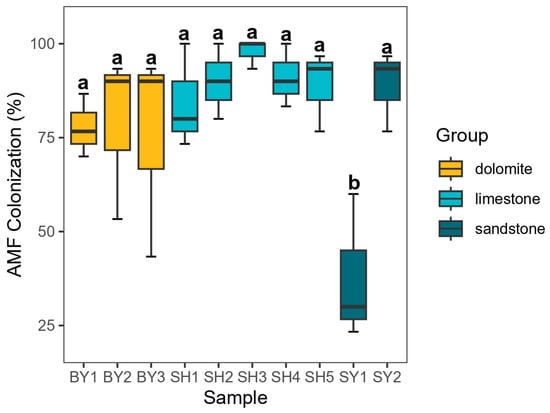 AMF colonization of Sophora japonica roots. Note: SY represents sandstone; SY1 and SY2 represent altitudes of 171.45 and 672.25 m, respectively. BY represents dolomite; BY1, BY2, and BY3 represent altitudes of 171.45 and 230.40 m, respectively. SH represents limestone; SH1, SH2, SH3, SH4, and SH5 represent altitudes of 319.10, 438.50, 537.40, 672.25, and 714.00 m, respectively. The difference in AMF colonization in each sampling group of S. japonica was represented by different lowercase letters (p < 0.05).