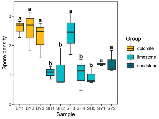 Density of AMF spores in rhizosphere soil of Sophora japonica. Note: SY represents sandstone; SY1 and SY2 represent altitudes of 171.45 and 672.25 m, respectively. BY represents dolomite; BY1, BY2, and BY3 represent altitudes of 171.45 and 230.40 m, respectively. SH represents limestone; SH1, SH2, SH3, SH4, and SH5 represent altitudes of 319.10, 438.50, 537.40, 672.25, and 714.00 m, respectively. The difference in AMF spore density in each sampling group of S. japonica was represented by different lowercase letters (p < 0.05).