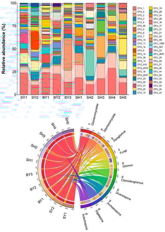 The average relative abundance of top 50 OTUs and AMF genera in Sophora japonica rhizosphere soil. Note: SY represents sandstone; SY1 and SY2 represent altitudes of 171.45 and 672.25 m, respectively. BY represents dolomite; BY1, BY2, and BY3 represent altitudes of 171.45 and 230.40 m, respectively. SH represents limestone; SH1, SH2, SH3, SH4, and SH5 represent altitudes of 319.10, 438.50, 537.40, 672.25, and 714.00 m, respectively. The left side of the circle indicates sample names, while the right side indicates the AMF. A connection between a group and a specific classification indicates the presence of AMF in the sample. A thicker connection indicates a higher species abundance. k: kingdom; p: phylum; c: class; g: genus.