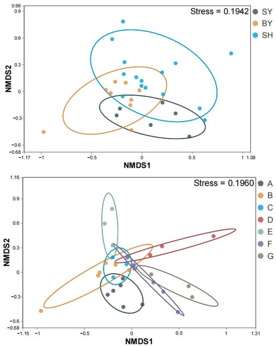 Rhizosphere soil AMF NMDS analysis of S. japonica. Note: SY represents sandstone; BY represents dolomite; SH represents limestone. A, B, C, D, E, F, and G represent altitudes of 171.45, 230.40, 319.10, 438.50, 537.40, 672.25, and 714.00 m, respectively. NMDS: non-metric multidimensional scaling. Different colors represent different groups.