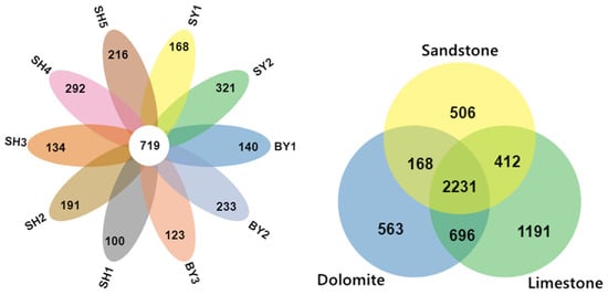 AMF Venn diagram of the OTUs within the rhizosphere of S. japonica cultivated in different soil types and at different altitudes. Note: SY represents sandstone; SY1 and SY2 represent altitudes of 171.45 and 672.25 m, respectively. BY represents dolomite; BY1, BY2, and BY3 represent altitudes of 171.45 and 230.40 m, respectively. SH represents limestone; SH1, SH2, SH3, SH4, and SH5 represent altitudes of 319.10, 438.50, 537.40, 672.25, and 714.00 m, respectively. Different colors represent different communities. Overlapping areas represent the number of OTUs shared by the group, while non-overlapping regions represent the number of different OTUs within the group.