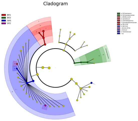 LEfSe analysis of AMF in S. japonica rhizosphere soil cultivated in different soil types and at different elevations. Note: SY represents sandstone; SY2 represents an altitude of 672.25 m. BY represents dolomite; BY1 and BY2 represent altitudes of 171.45 and 230.40, respectively. SH represents limestone; SH5 represents an altitude of 700–800 m. A, B, C, E, and G represent altitudes of 171.45, 230.40, 319.10, 537.40, and 714.00 m, respectively. LEfSe: Linear discriminant analysis Effect Size.