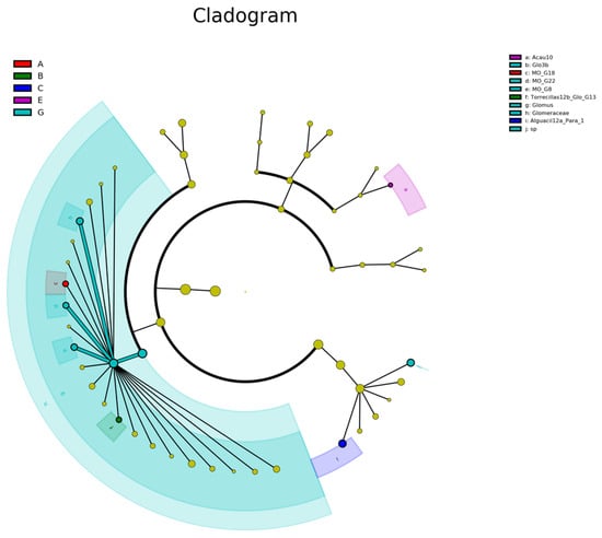 Venn diagram analysis (Figure 5) revealed 719 common OTUs in the rhizosphere soil of all groups, with the number of distinct OTUs ranging from 100 to 292 per group. Limestone plots exhibited a higher count of distinct OTUs compared to those in dolomite and sandstone. Additionally, the LefSe study (Figure 6) underscored the variances in AMF community structure within the rhizosphere soil of S. japonica, varying by lithology and altitude. The species with differing AMF abundances in the rhizospheres across different lithologies included Glomus Wirsel_OTU6 (sandstone), G.MO_G18 (dolomite), and G.MO_G22 (limestone). The species with differing AMF abundances at different altitudes included G.MO_G18 at an altitude of 100–200 m, G.Torrecillas12b_Glo_G13 at an altitude of 200–300 m, and G.Glo3b, G.MO_G22, and G.MO_G8 at an altitude of 700–800 m. Overall, we primarily identified 6 Glomus species with differential AMF abundances in rhizosphere soils with different lithologies and altitudes.
