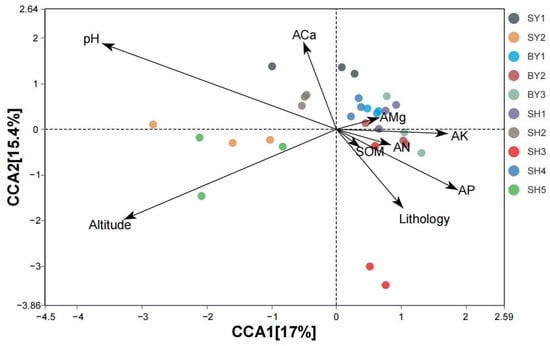 CCA of environmental factors and S. japonica rhizosphere AMF. Note: different arrows represent distinct environmental factors and different points represent individual samples. The longer the arrow, the greater the effect on the sample. The sharp angle between the arrows is positively correlated with environmental factors, and the obtuse angle is negatively correlated. The sample is projected onto an environmental factor or its extension line; the relative position of the projection point represents the relative size of the environmental factor value in the sample. SY represents sandstone; SY1 and SY2 represent altitudes of 171.45 and 672.25 m, respectively. BY represents dolomite; BY1, BY2, and BY3 represent altitudes of 171.45 and 230.40 m, respectively. SH represents limestone; SH1, SH2, SH3, SH4, and SH5 represent altitudes of 319.10, 438.50, 537.40, 672.25, and 714.00 m, respectively. AP: available phosphorus. AN: available nitrogen. AMg: available magnesium. ACa: available calcium. AK: available potassium. SOM: soil organic matter.