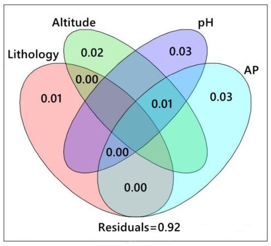 CCA results (Figure 7) showed that environmental factors such as altitude, pH, and lithology were closely related to the AMF community, which were important factors affecting the distribution of AMF in the rhizosphere soil of S. japonica. CCA1 and CCA2 explained 17.0% and 15.4% of the total variables, respectively. Additionally, VPA (Figure 8) identified an interpretation rate of 3% regarding the contribution of pH and AP to the variation. Moreover, altitude and lithology were determined to exhibit interpretation rates of 2% and 1%, respectively. Notably, the shared influence of pH, AP, and altitude was determined at 1% and an unidentified portion was determined at 92%. Overall, lithology, altitude, pH, and AP all play an important role in the formation of S. japonica rhizosphere AMF, with pH and AP emerging as leading factors.