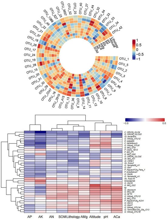 Spearman correlation heat map of the average relative abundance of top 50 OTUs and AMF species level and environmental factors. Note: the horizontal rows represent the AMF and the vertical columns represent the phenotypic information of the sample. Red and blue represent positive and negative correlations, respectively. The depth of the color represents the level of correlation. AP: available phosphorus. AN: available nitrogen. AMg: available magnesium. ACa: available calcium. AK: available potassium. SOM: soil organic matter. P.: Paraglomus. G.: Glomus. C.: Claroideoglomus. Gi.: Gigaspora. D.: Diversispora. Ac.: Acaulospora. Ar.: Archaeospora. sp.: no species-level information. Unassigned: unable to classify.