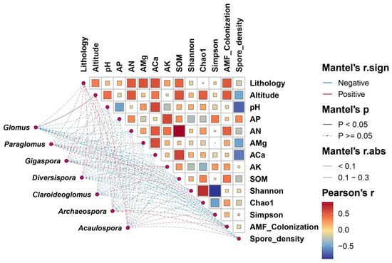 Pearson correlation relationship between AMF properties and environmental factors. Note: the line color of the network diagram represents the correlation between each AMF genus and ecological factor; red and blue represent positive and negative correlations, respectively. The line type of the network diagram represents the p-value range; the solid represents p < 0.05 and the dot-dash represents p ≥ 0.05. The line thickness represents the absolute value of the correlation coefficient. Correlation Heat map color represents the correlation of ecological factors. AP: available phosphorus. AN: available nitrogen. AMg: available magnesium. ACa: available calcium. AK: available potassium. SOM: soil organic matter.