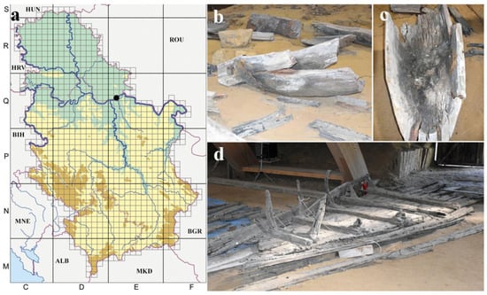 Archeological wooden artifacts in the Mammoth Park of the archaeological site “Viminacium” before conservation treatment: (a) UTM map of Serbia with marked location of the archaeological site “Viminacium (black dot)”; (b,c) monoxyle; (d) shipwreck. Country abbreviations: HUN—Hungary; ROU—Romania; BGR—Bulgaria; MKD—North Macedonia; ALB—Albania; MNE—Montenegro; BIH—Bosnia and Herzegovina; HRV—Croatia.