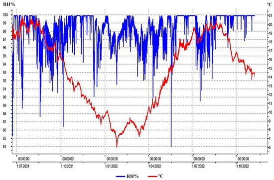 Fluctuations of temperature (T °C; red line) and relative air humidity (RH%; blue line) of the Mammoth Park ambient within the 18-month measuring period.