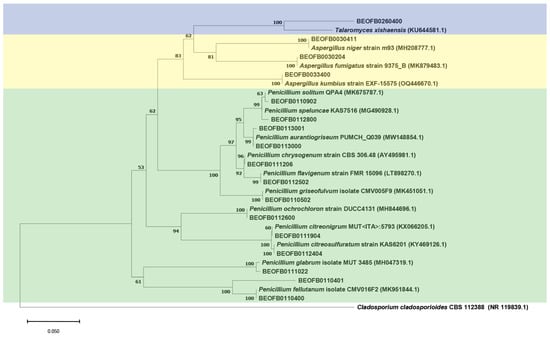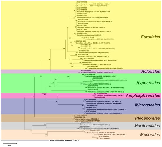The neighbor-joining tree of the ITS region is shown in Figure 3 and the BenA tree is shown in Figure 4. All Aspergilli and Penicillia clustered together in a well-supported Eurotiales clade (bootstrap value (bs) = 100). Beauveria fellina, Trichoderma zeloharzianum, Sarocladium spinificis, Fusarium langsethiae, and Lecanicilium dimorphum clustered together in a Hypocreales clade (bs value = 59). Likewise, Cephalotrichum and Apiospora isolates clustered together with Hypocreales isolates in the Sordariomycetes clade (bs value = 98). All Ascomycota clustered together (bs value = 97), as did the isolates of the Mucorales and Mortierellales orders in the Mucoromycota clade (bs value = 76).