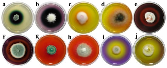 To qualitatively determine extracellular pigment production, fungal isolates were tested on minimal Czapek–Dox agar (mCzA) according to the instructions of Borrego et al. []. In 1 L of distilled water, we dissolved NaNO3, 2 g; K2HPO4, 1 g; MgSO4 × 7H2O, 0.5 g, glucose (Sigma-Aldrich, St. Louis, MO, USA), 1 g; and agar (Lab M, Heywood, UK), 20 g. The pH level was adjusted to 5.5. The medium was sterilized at 114 °C for 25 min. Plates were inoculated and incubated at 25 ± 1 °C for 7 days. The coloration of a transparent medium was considered to indicate a positive reaction.