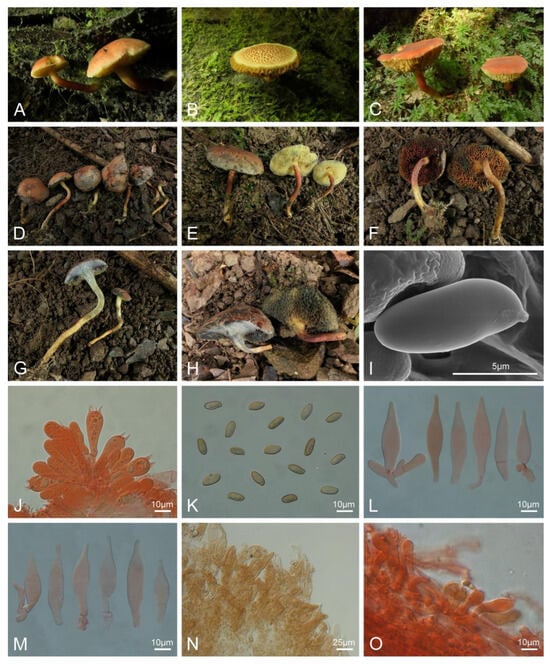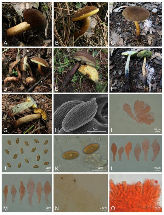 - Zhou, F.; Gao, Y.; Song, H.Y.; Hu, H.J.; Juan, Y.W.; Zhang, W.; Liao, L.Y.; Fang, Y.; Cheng, L.; Hu, D.M. Phylogenetic and Morphological Evidence Reveal Five New Species of Boletes from Southern China. J. Fungi 2023, 9, 814. [Google Scholar] [CrossRef] [PubMed]