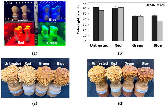 Light treatment of Flammulina velutipes fruiting bodies. (a) Light-emitting diode (LED) treatment. (b) Colors of the light-treated fruiting bodies (c) 24 h and (d) 48 h after light treatment.