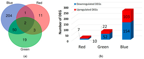 Venn diagram (a) and number (b) of differentially expressed genes (DEGs) identified after the red, green, and blue light treatments of F. velutipes.