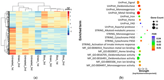 In total, 290 genes were identified as DEGs in light-treated F. velutipes, and 273 DEGs were identified in samples treated with only blue and green lights, but not in those treated with red light. Figure 3a shows a heatmap of the 105 upregulated and 168 downregulated genes among the identified 273 DEGs. Then, DEG enrichment analysis was conducted using the STRING database. Among the 273 DEGs, only 168 downregulated DEGs in blue- and green-light-treated F. velutipes were enriched and classified using the Gene Ontology (GO) molecular function (MF), STRING cluster, and UniProt keywords (Figure 3b; Table S3). These downregulated DEGs were significantly enriched in three categories of the STRING database: monooxygenase activity (GO:0004497) in MF, alkaloid metabolic process in the STRING cluster, and monooxygenase in UniProt keywords. Enrichment analysis revealed that the downregulated DEGs were enriched in monooxygenase activity in all three categories (Table S3).