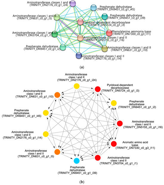 We previously identified a gene related to the fruiting body color of F. velutipes [25]. Comparative genomic analysis of different F. velutipes strains revealed 70 white strain-specific variations, including single-nucleotide polymorphisms and indels, with one mutation causing a deletion in the phenylalanine ammonia-lyase 1 (Fvpal1; EC 4.3.1.24) gene. This mutation is color-specific for white strains and plays an important role in determining the color of the fruiting body. Here, Fvpal1 was identified as an upregulated DEG (log2FC 1.27) only in blue-light-treated F. velutipes (Table S2). Further analysis, including enrichment and PPI network analyses of Fvpal1 (TRINI-TY_DN7330_c0_g3_i11), was performed using the STRING database and Cytoscape software. As shown in Figure 4a, 11 nodes and 44 edges were obtained with scores > 0.4. CytoHubba application of Cytoscape software was used to identify the hub genes in the PPI network (Figure 4b). All identified hub genes with closeness and degree of connectivity are listed in Table 2 and Table S5. Among the identified genes, only one gene (TRINITY_DN5724_c0_g1_i3) acted as an upregulated DEG in blue-light-treated F. velutipes. This gene was annotated to have a pyridoxal-dependent decarboxylase-conserved domain using the Pfam database.