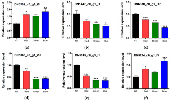 Relative expression levels of the upregulated genes under all light conditions (a), downregulated genes under blue and green lights (b–e), and upregulated genes under blue light (f). Data were analyzed using one-way analysis of variance (ANOVA) followed by Tukey’s test. * p < 0.05, ** p < 0.01, and *** p < 0.001 vs. non-treated sample. NT, non-treated; Red, red LED treated; Green, green LED treated; Blue, blue LED treated.