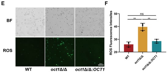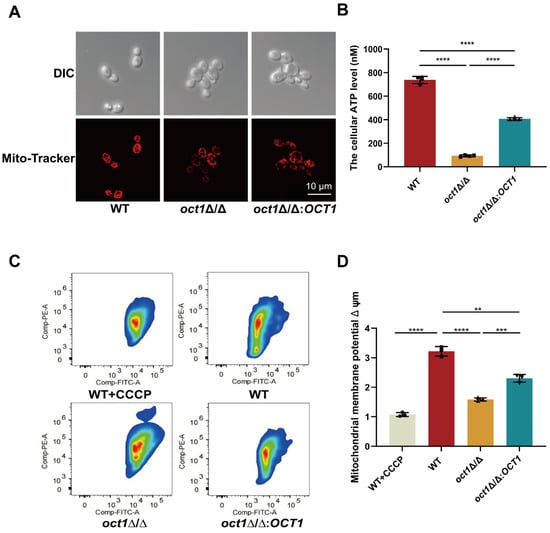To study the role of OCT1 in mitochondrial functions, we employed the HIS1-LEU2-ARG4 screening system to generate a single-gene deletion strain oct1∆::HIS1, the oct1∆/∆ mutant, and the oct1 gene-reconstituted strain oct1∆/∆:OCT1. The validation results of polymerase chain reaction (PCR) and nutritional screening showed that the strains were successfully constructed (in Figures S1 and S2). Given the potential association between Oct1p and mitochondrial function, firstly, mitochondrial fluorescence dye Mito-Tracker Red was used to conduct mitochondrial staining on the C. albicans cells of each strain to observe the influence of Oct1p loss on mitochondrial morphology (Figure 1A). The results showed that the cells of WT contained 5–10 granular or rod-like mitochondrial tubules, which were discrete from each other. The oct1Δ/Δ cells contained several discrete granular mitochondrial tubules, most of which were dispersed in a fragmented state, and the oct1∆/∆:OCT1 mitochondrial morphology was similar to the oct1Δ/Δ in the form of dispersed fragments. Then, we employed the BacTiter-Glo™ microbial cell activity detection kit to quantify intracellular adenosine triphosphate (ATP) levels in WT, oct1∆/∆, and oct1∆/∆:OCT1 strains (Figure 1B). Specifically, the intracellular ATP concentration in WT cells was measured at approximately 738 nM, while the oct1∆/∆ mutant exhibited a markedly reduced intracellular ATP content of approximately 93 nM. The intracellular ATP content of the oct1∆/∆:OCT1 strain measured approximately 407 nM, representing a significant increase in ATP levels compared to the oct1∆/∆ mutant. These findings indicate a crucial role for Oct1p in the regulation of intracellular ATP levels. Furthermore, the levels of mitochondrial membrane potential (MMP) were assessed using the JC-1 detection kit for the aforementioned three strains, providing insight into the aerobic capacity of cells (Figure 1C,D). The mean membrane potential ratio of WT was 2.6, while that of the oct1∆/∆ mutant was 1.4, a statistically significant decrease compared to the WT, indicating a potential role of Oct1p in modulating cellular membrane potential. The mean membrane potential ratio of the oct1∆/∆:OCT1 strain was 1.6, demonstrating a substantial restoration relative to the oct1∆/∆ mutant. These findings support the hypothesis that the diminished membrane potential in the oct1∆/∆ mutant is attributable to the absence of Oct1p. Reactive oxygen species (ROS) is a by-product of cell growth and development. Excessive or insufficient production of ROS in cells can impact cell growth and development. In this study, intracellular levels of ROS were assessed using DCFH-DA probe staining (Figure 1E,F). The results showed that ROS production in the oct1∆/∆ mutant was significantly higher than that in WT, indicating that lack of Oct1p does lead to an abnormal increase in intracellular ROS production.