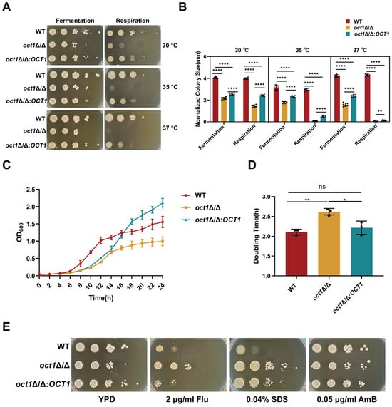 The carbon metabolism pathway of C. albicans primarily consists of glycolysis and aerobic respiration. Impairment of mitochondrial function is likely to impact the aerobic respiration process. Hence, to examine the impact of OCT1 deficiency on the utilization of carbon sources and mitochondrial function in C. albicans, we employed glucose and glycerol-anhydrous ethanol blends as carbon sources in the medium. Subsequently, we assessed the growth conditions of WT, oct1∆/∆, and oct1∆/∆:OCT1 strains at temperatures of 30 °C, 35 °C, and 37 °C, respectively (Figure 2A). There were no notable distinctions observed in the colony phenotypes of the WT, oct1∆/∆, and oct1∆/∆:OCT1 strains when grown on glucose-enriched solid medium YPD. Conversely, when cultivated on glycerol-anhydrous ethanol-mixture-enriched solid medium YPEG, the oct1∆/∆ mutant displayed pronounced growth impairments relative to the WT. The exacerbation of these deficiencies was particularly pronounced at an elevated temperature of 37 °C, where the oct1∆/∆ mutant exhibited severely impaired growth. In contrast, the oct1∆/∆:OCT1 strain displayed normal growth across all experimental conditions. Furthermore, the colony sizes of these strains were quantified and statistically analyzed using the coating culture method (Figure 2B). These findings indicate that the absence of Oct1p in C. albicans could potentially result in a reduction in the strain’s ability to metabolize glycerol anhydride ethanol. Additionally, the results suggest that Oct1p may have a significant impact on mitochondrial respiration, particularly as temperatures rise. The analysis of growth rates demonstrates that the growth of the oct1∆/∆ mutant is notably slower than that of the WT, indicating a clear positive regulatory role for Oct1p in the growth of C. albicans (Figure 2C). In addition, by analyzing the doubling time of each strain (Figure 2D), we found that the doubling time of WT was about 2 h, while that of oct1Δ/Δ was about 2.6 h, which was significantly increased compared with WT, and that of oct1∆/∆:OCT1 was about 2.2 h, which recovered significantly compared with oct1Δ/Δ. Prior research has indicated that disruptions in mitochondrial function in C. albicans are frequently linked to changes in cell wall integrity or membrane function. In light of this, we assessed the susceptibility of the WT, oct1∆/∆ mutant, and oct1∆/∆:OCT1 strain to stress-inducing agents that target the cell membrane and cell wall. Specifically, we exposed the strains to Congo Red (CR) and Calcofluor White (CFW) in the growth medium to induce cell wall stress. In relation to membrane stress, FLU and AmB were chosen as antifungal reagents alongside SDS. The results indicate that the oct1∆/∆ mutant exhibited significant resistance to fluconazole and SDS, while displaying no discernible abnormal phenotypes in response to cell wall pressure agents CFW, CR, or AmB (Figure 2D and Figure S3).