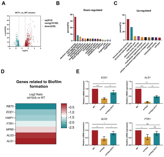 To further investigate the role of Oct1p in C. albicans, transcriptome sequencing was conducted on the oct1∆/∆ mutant on three biological replicates, followed by a comparative analysis with the wild-type strain. The difference in expression levels was determined based on the criteria of a |log2fold change| > 1, with a false discovery rate of 0.05, for the identification of differentially expressed genes (DEGs) (Figure 3A). In comparison to the WT, the oct1∆/∆ mutant exhibited an increased expression of 614 genes and a decreased expression of 239 genes. Furthermore, gene ontology (GO) functional enrichment analysis was performed on these differentially expressed genes to investigate the involvement of OCT1 in C. albicans. Our analysis revealed that the down-regulated genes were significantly enriched in functions such as electron carrier activity (36.3%), cell aggregation (8.3%), transporter activity (6.2%), biological adhesion (3.5%), single-organism process (3.2%), and multi-organism process (3.1%). Conversely, the up-regulated genes exhibited enrichment in immune system processes (50%), structural molecule activity (30.9%), organelle part (9.1%), electron carrier activity (9.1%), macromolecular complex (7%), and multicellular organismal processes (6.7%) (Figure 3B,C). Significantly, the oct1∆/∆ mutant exhibited decreased expression levels of genes linked to cell aggregation and biological adhesion, suggesting a potential impact of Oct1 loss on the adhesion and aggregation capabilities of C. albicans. These processes play a crucial role during hyphal growth. Subsequently, we conducted a screening of annotated genes associated with C. albicans adherence, growth, and aggregation within the differentially expressed genes (DEGs) of the oct1∆/∆ mutant, utilizing the Kyoto Encyclopedia of Genes and Genomes (KEGG) database for enrichment analysis. The expression levels of seven genes were identified (Figure 3D), including genes such as ECE1, which has been associated with the virulence factors of C. albicans, such as adhesion, biofilm formation, and filamentation properties, and ALS1 and ALS3 in the lectin-like sequence family that plays essential roles in the processes of adherence and biofilm formation in vitro, as well as the high-affinity iron permease FTR1, a gene crucial for C. albicans growth [35,36,37]. To further confirm the transcription levels of these genes, quantitative real-time PCR was used to verify the expression levels of these four genes. The expression levels of these four genes were down-regulated in the oct1∆/∆ mutant compared with the WT, which was consistent with the results in the transcriptome (Figure 3E). These results suggest that OCT1 may be involved in the adhesion, aggregation, and hyphal growth of C. albicans.