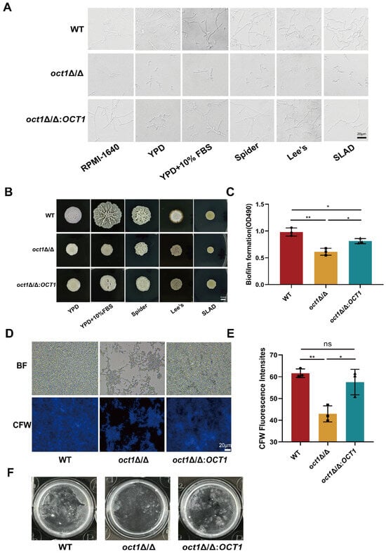 To further confirm the functions of Oct1p, we examined the abilities of the hyphal formation, biofilm formation, and adhesion of the corresponding mutants, respectively. First, we observed and analyzed the hyphal formation status of the WT, the oct1∆/∆ mutant, and the oct1∆/∆:OCT1 that were cultured in six different liquid media: RPMI-1640, YPD, YPD + 10% FBS, Lee’s, Spider, and SLAD (Figure 4A). The WT exhibited normal germination and hyphal growth across all culture conditions, whereas the oct1∆/∆ mutant displayed severely restricted hyphal growth, failing to reach the levels observed in the WT and forming only short pseudohyphae. The hyphal morphology of the oct1∆/∆:OCT1 strain closely resembled that of the WT. Furthermore, we conducted a comparative analysis of the colony growth among these three strains on five distinct solid media: YPD, YPD + 10% FBS, Lee’s, Spider, and SLAD (Figure 4B). In comparison to the WT, the oct1∆/∆ mutant exhibited a notable reduction in colony size with predominantly smooth edges and an inability to form normal hyphae. Conversely, the oct1∆/∆:OCT1 mutant displayed a restoration of solid hyphal formation capability when compared to the oct1∆/∆ mutant. These findings suggest that Oct1p plays a crucial role in the hyphal growth process of C. albicans. Then, we explored the effect of Oct1p on the biofilm formation of C. albicans by XTT (dimethoxazole yellow) detection and CFW staining (Figure 4C–E). The results showed that the biofilm formation of the oct1∆/∆ mutant was significantly reduced compared with the WT. Finally, through the detection of the adhesion of the WT, the oct1∆/∆ mutant, and the oct1∆/∆:OCT1 (Figure 4F), we found that the adhesion of the oct1∆/∆ mutant was also significantly weakened compared with the WT. These results suggest that OCT1 plays an important role in hyphal growth, adhesion, and biofilm formation.