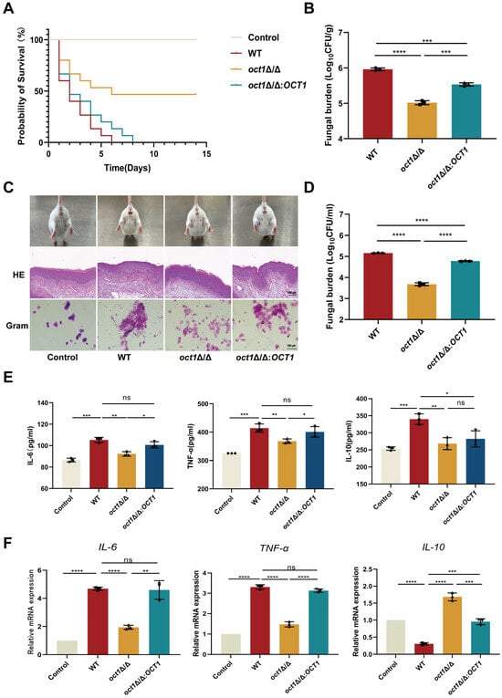 The absence of Oct1p reduces the infective ability of C. albicans in G. mellonella and mice. (A) The concentration of each C. albicans liquid was adjusted to 8.0 × 106 cells/mL with PBS, and 10 μL of each C. albicans liquid was introduced and injected into the left or right hypophysis of G. mellonella larvae using a pointed microinjection needle, and then placed in the incubator at 37 °C after making the molds and incubated, and then the deaths of G. mellonella were observed and recorded every day. The experiment lasted for 14 days. (B) Fungal load in the G. mellonella at 48 h after the injection of each fungal solution into the larvae of the G. mellonella. (C) Localized state of the mouse vagina, histopathological changes in the vaginal mucosa, and the morphology of C. albicans in vaginal lavage fluid 7 days after infection with vulvovaginal candidiasis. Scale bar: 100 μm. (D) Fungal load in the vaginal lavage fluid of mice 7 days after infection with vulvovaginal candidiasis. (E) The method of ELISA was used to detect the levels of IL-6, TNF-α, and IL-10 in mouse vaginal tissues. (F) The method of qRT-PCR was used to detect the expression of IL-6, TNF-α, and IL-10 genes in mouse vaginal tissues. (ns, not significant; *, p < 0.05; **, p < 0.01; ***, p < 0.001; and ****, p < 0.0001).