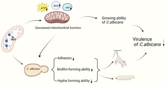 Despite evidence suggesting that dysfunctional mitochondria in C. albicans can hinder the formation of hyphae [6], the precise mechanisms governing morphological transitions and the regulation of hyphal growth in response to mitochondrial function in this organism are not yet fully understood. Furthermore, research has demonstrated that the transition of C. albicans from the yeast state to the hypha state is intricately linked to its pathogenicity [44]. Fungal cell virulence is often determined by their ability to adhere and form biofilms. This is supported by the observation that C. albicans cells extracted from mature biofilms exhibit enhanced adhesion capabilities and biofilm-forming abilities [45]. Based on the observed phenotypes of the oct1∆/∆ mutant, it is hypothesized that the absence of Oct1p may influence the virulence of C. albicans. To investigate this hypothesis, two infection models involving G. mellonella and the mouse vagina were utilized to assess the virulence of the oct1∆/∆ mutant. Ultimately, the results indicate that the oct1∆/∆ mutant exhibits significantly reduced virulence compared to the WT. Furthermore, through staining, microscopic observation, and detection of fungal load in the vaginal lavage fluid of mice, our study revealed a significantly lower residual amount of hyphae in the vaginal lavage fluid of mice infected with the oct1∆/∆ mutant compared to the WT. Additionally, the oct1∆/∆ group exhibited predominantly sprouting spores or very short pseudohyphae, with a notable absence of mature hyphae. This suggests that the reduced virulence of the oct1∆/∆ mutant in C. albicans may be attributed to its impaired ability to form hyphae, a characteristic closely linked to virulence. Additionally, analysis of immune factor expression in the vaginal tissues of infected mice revealed that the oct1∆/∆ mutant elicited a weaker immune response compared to the wild-type strain, further supporting the notion that the knockout of OCT1 resulted in a less virulent phenotype. In summary, the findings of our study indicate that Oct1p is involved in the regulation of cellular, hyphal, and biofilm growth processes in C. albicans by affecting mitochondrial function, as well as in interactions with the host that contribute to the formation of pathogenicity (Figure 6).