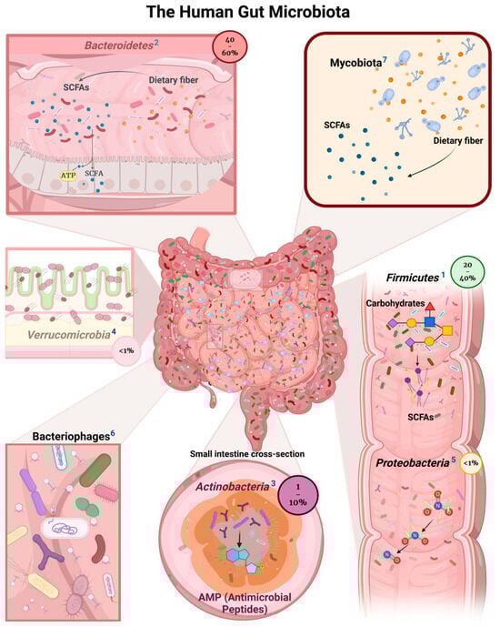 The Human Gut Microbiota. 1 Firmicutes are one of the most common types of phyla in GM. They break down complex carbohydrates to produce SCFAs (short-chain fatty acids) like butyrate, acetate, and propionate. These SCFAs are important sources of energy for both the host and the bacteria. Aside from that, Firmicutes produce vitamins, which makes them a good ally of the digestive system [49,50,51]. Among the Firmicutes, the family Lactobacillaceae is particularly adept at fermenting sugars into lactic acid, a process crucial for maintaining a healthy gut environment. Notably, the genus Lactobacillus has been reclassified into 25 distinct genera based on whole-genome sequencing by Zheng et al. (2020), which underscores the genetic and functional diversity within this bacterial group. This reclassification enhances our understanding of the specific roles these bacteria play in the gut, from producing short-chain fatty acids to interacting with the host’s immune system [52]. 2 Bacteroidetes is a major phylum of Gram-negative bacteria found abundantly in the human gut microbiota. This group of bacteria plays an important role in digesting complex molecules like polysaccharides and fibers, thereby contributing significantly to the host’s energy metabolism and overall gut health. Bacteroidetes are involved in breaking down carbohydrates that are indigestible by human enzymes, converting them into SCFAs like acetate, propionate, and butyrate, which serve as energy sources for the host and help maintain the health of the gut lining [53,54]. 3 Actinobacteria, although not as abundant as Firmicutes and Bacteroidetes, are critical in the development of immune system processes. They affect gut-associated lymphoid tissue, which is important for immunological maturation and defense against pathogens [55,56]. 4 The phylum Verrucomicrobia are known for their unique shapes and the ability to degrade various polysaccharides, making them significant in the carbon cycle of their respective habitats [57,58]. 5 Proteobacteria are typically present at low levels and contribute to the microbial diversity and balance within the gut and take part in various metabolic processes, including the breakdown of complex compounds and the production of substances that can be beneficial for the host’s health [59]. 6 Bacteriophages, often referred to as phages, are viruses that specifically infect bacteria. In the human gut, these microscopic entities play a critical role in shaping the composition and functionality of the microbiota [60,61]. 7 The mycobiota in the human gut has received relatively less attention compared to its bacterial counterparts, but it plays a significant role in human health and disease control. The gut mycobiota interact with the host’s immune system and other microbes in the microbiome and contribute to the overall balance and functionality of the gut ecosystem [53,62].