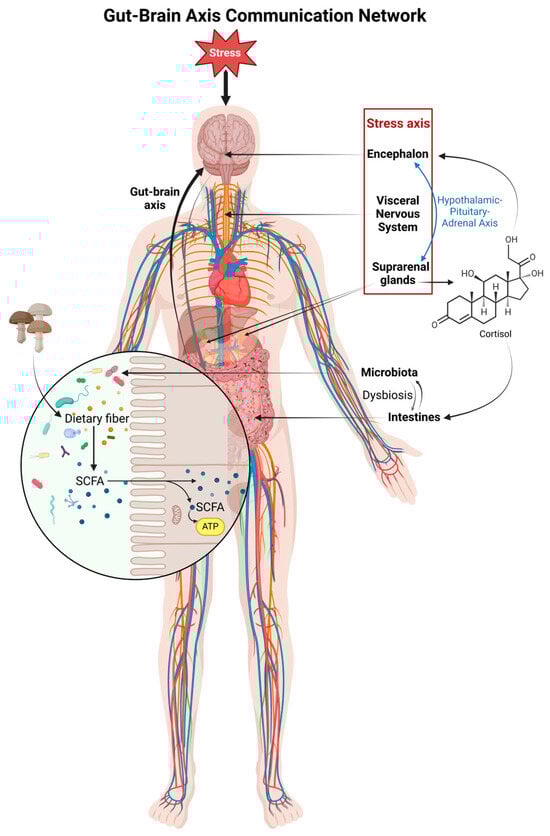 In Figure 3, stress is depicted as a stimulus that impacts the central nervous system (CNS), influencing both the hypothalamic–pituitary–adrenal (HPA) axis and the visceral nervous system (VNS), which governs involuntary physiological processes. The CNS communicates with the gastrointestinal (GI) tract, where trillions of gut microbes reside and interact with the local mucosal environment, as shown in the inset of the colon barrier. The gut microbiota can modulate brain function and metabolism by producing signaling molecules, such as short-chain fatty acids (SCFAs) from the fermentation of dietary fibers, which can enter systemic circulation and reach distant target sites, including the brain.