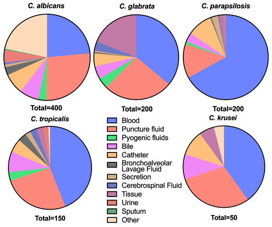 - Sharifi, M.; Badiee, P.; Abastabar, M.; Morovati, H.; Haghani, I.; Noorbakhsh, M.; Mohammadi, R. A 3-year study of Candida infections among patients with malignancy: Etiologic agents and antifungal susceptibility profile. Front. Cell. Infect. Microbiol. 2023, 13, 1152552. [Google Scholar] [CrossRef] [PubMed]