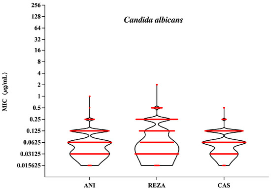 MICs of anidulafungin, rezafungin and caspofungin for C. albicans isolates. ANI, anidulafungin; REZA, rezafungin; CAS, caspofungin.