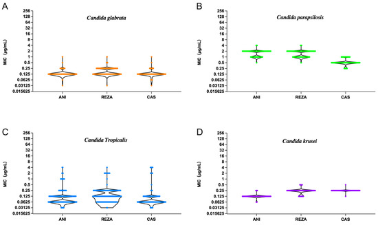 MICs of anidulafungin, rezafungin and caspofungin against four common non-albicans Candida isolates. (A): MICs against C. glabrata; (B): MICs against C. parapsilosis; (C): MICs against C. tropicalis; (D): MICs against C. krusei. ANI, anidulafungin; REZA, rezafungin; CAS, caspofungin.