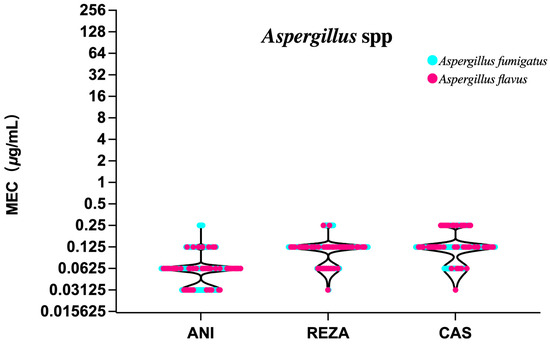 MECs of anidulafungin, rezafungin and caspofungin against two common Aspergillus isolates. ANI, anidulafungin; REZA, rezafungin; CAS, caspofungin.
