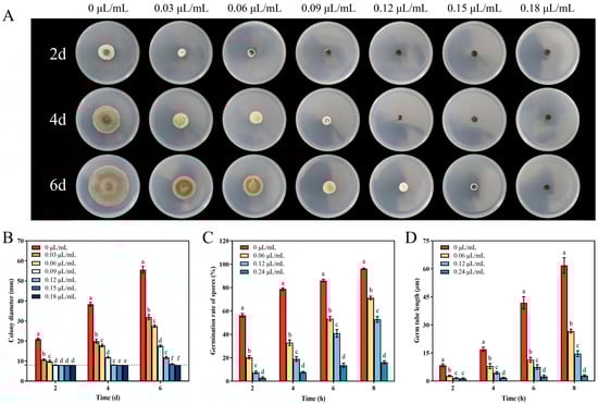 Effect of CVR on colony morphology (A), colony diameter (B), spore germination rate (C), and germ tube length (D) of A. alternata. Colony diameter was examined every 2 days after incubation at 28 °C for a total of 6 days. According to Duncan’s multiple comparisons, different letters indicate significant differences (p < 0.05).