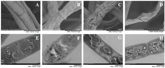 SEM analysis revealed that the control samples had a normal structure and consistent, uniform, and strong hyphae of a fixed width (Figure 2A). However, the hyphae treated with CVR showed significant changes in their morphology. The hyphae appeared as small, dot-like particles on the surface, with distorted, partially flattened, and withered hyphae (Figure 2B–D). Additionally, the extent of damage to the hyphae increased with the concentration of CVR.