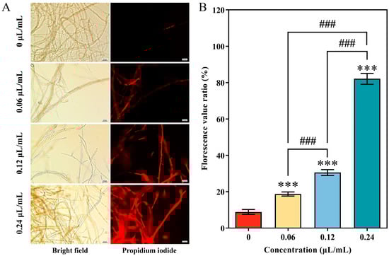 The mycelial cells were stained with PI in the presence and absence of CVR. The results indicated that the cell membrane integrity of A. alternata decreased in a concentration-dependent manner with CVR treatment (Figure 3A). This was evident from the increased staining intensity observed in PI staining (Figure 3B). At a concentration of 0.24 μL/mL of CVR, 81% of the cells showed impaired membrane integrity with PI fluorescence.