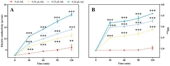 The leakage of cytoplasmic contents from A. alternata mycelia was measured according to a previously described method with minor modifications [,]. A spore suspension of 500 μL (5 × 105 spores per mL) was inoculated in 100 mL potato dextro broth (PDB) medium and cultured at 28 °C and 160 rpm for 2 days. The hyphae were collected by means of centrifugation at 8000× g for 10 min, and washed with sterile deionized water 3 times. A total of 1 g of mycelia was resuspended in 20 mL sterile distilled water containing 0.00, 0.06, 0.12, and 0.24 μL/mL CVR, and incubated on a rotary shaker at 28 °C for 0, 30, 60, 90, and 120 min. Cell membrane permeability was measured using an electric conductivity meter (DDS-11A, Shanghai, China). Nucleic acids levels were measured with a microspectrophotometer (Nano-500, Guangzhou, China) at 260 nm (OD260). All experiments were performed in triplicate.