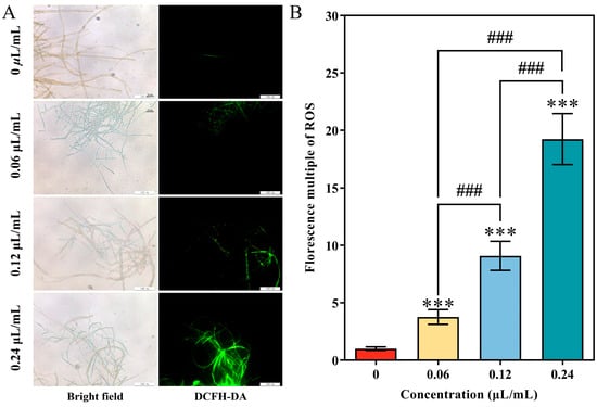 A. alternata mycelia treated with or without CVR were stained with 10 μM 2,7′-dichlorofluorescein diacetate (DCFH-DA) for half an hour at 37 °C in the dark. After washing 3 times with PBS, the ROS distribution and fluorescence intensity were assessed using a Leica DM3000 microscope (Leica Microsystems CMS GmbH, Wetzlar, Germany) [].