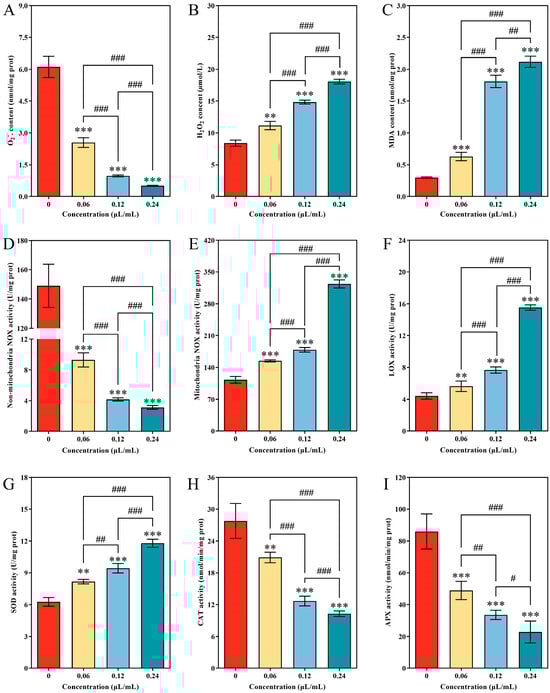 Effects of CVR on antioxidant substances and antioxidant enzyme activity of A. alternata. (A) O2·−, (B) H2O2, (C) MDA, (D–F) LOX, (G) SOD, (H) CAT, and (I) APX. ** (p < 0.01), *** (p < 0.001) vs. control group, # (p < 0.05), ## (p < 0.01), ### (p < 0.001) between different treatments.