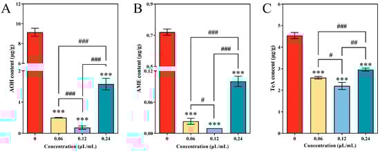 Three types of mycotoxins, namely, AOH, AME, and TeA, were extracted and detected from the mycelia of A. alternata using UPLC-TOF-ESI-MS. The content of AOH, TeA, and AME in A. alternata mycelium decreased significantly with the increase in CVR concentration (Figure 7). In the CVR treatment groups with a concentration of 0.12 μL/mL, the content of AOH, AME, and TeA was only 2.00%, 1.39%, and 48.46% of the corresponding control groups, respectively.