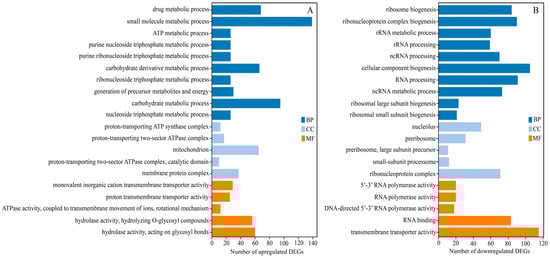 Gene ontology (GO) enrichment analysis of differentially expressed genes (DEGs). Top 20 results of the highest enrichment level were separately obtained from the analysis of upregulated DEGs (A) and downregulated DEGs (B). The columns of dark blue, light blue, and orange represent biological process (BP), cellular component (CC), and molecular function (MP), respectively.