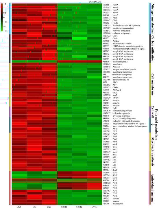 In Figure 9, it is shown that the differential genes were mainly related to seven biological processes such as nitrogen metabolism, carbon utilization, cell membrane, cell wall, fatty acid metabolism, mycotoxin synthesis and antioxidant enzyme. Nitrogen metabolism and carbon utilization are related to the nutritional growth and biosynthesis of A. alternata. After the CVR treatment, 12 genes involved in nitrogen metabolism were downregulated, while 1 gene was upregulated and 10 genes were downregulated in carbon utilization. These indicated that the CVR treatment inhibited nitrogen metabolism and carbon utilization, with the exception of isocitrate lyase CC77DRAFT 926519 in A. alternata. Following the CVR treatment, there was significant downregulation in 17 genes related to cell membrane transport and 4 genes related to cell wall construction in A. alternata. Additionally, the expression of 6 genes related to fat metabolism and 15 genes related to mycotoxin synthesis was inhibited by the CVR treatment. Furthermore, the genes regulating SOD, POD, laccase, and thioredoxin in A. alternata showed differential expression after the CVR treatment. Among them, two genes regulating laccase and one gene regulating thioredoxin were downregulated. Notably, the genes regulating SOD and POD exhibited both upregulation and downregulation simultaneously.