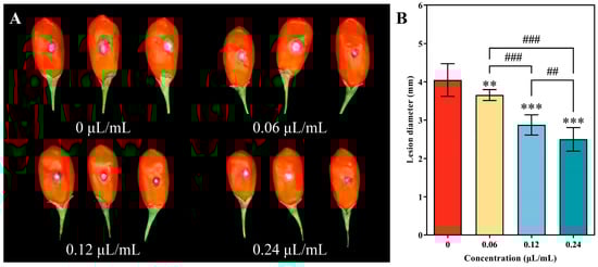 It has been found that the use of CVR for fumigation is effective in preventing the development of black mold on goji berries which have been inoculated with A. alternata. As shown in Figure 10, after two days of inoculation, the lesion diameters of the berries were reduced by 9.63%, 28.89%, and 38.27% with 0.06, 0.12, and 0.24 μL/mL CVR treatment, respectively, compared to the untreated berries (Figure 10B). The highest level of disease control was observed in berries treated with 0.24 μL/mL of CVR (Figure 10A).