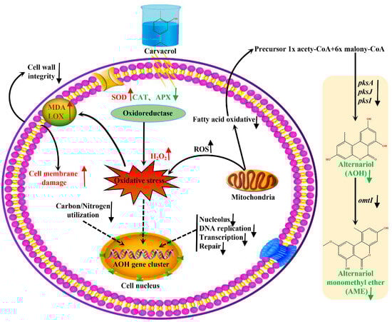Essential oils (EOs) and plant-derived antimicrobial agents, which have been used as preservatives or antiseptics and disinfectants, may be natural alternatives to chemical preservatives [,,]. Most importantly, abundant studies have shown that most plant essential oils are generally recognized as safe (GRAS) []. The components of EOs and plant-derived antimicrobials, such as carvacrol (CVR) [], citral [], magnolol [], ursolic acid [], ethyl p-coumarate [,], and caffeic and p- coumaric acids [], exhibit strong antifungal activity on A. alternata. Among them, CVR derived from Origanum vulgare L. has attracted more and more attention due to its outstanding biological activities such as antifungal, antioxidant, anticancer, anti–inflammatory, and fresh-keeping activity [,]. CVR has been approved by the US Food and Drug Administration (FDA) as a food additive []. Research reports show that CVR has obvious broad-spectrum inhibitory effects against various plant pathogenic fungi, including Aspergillus flavus [], Botrytis cinerea [], Colletotrichum fructicola [], Penicillium digitatum, and P. italicum []. However, there are few research reports on CVR’s inhibition of A. alternata in goji berries.