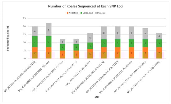 The heterozygous alleles for seven of the nine putative SNPs were observed in more than half of the colonized group analyzed at each locus (Figure 3). This was high compared with only one and four putative SNPs occurring in more than half of the negative and invasive groups, respectively. The colonized koalas were also the only study group with all ten SNPs. SNP NW_018343963.1:19,369,152C > T(intron) was only seen in two colonized koalas, DECC015M and USYD006M. These two koalas were also the two with the most putative SNPs present in exon 6, 9, and 8, respectively.