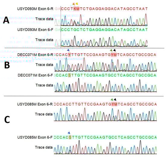 Excerpts from Sanger sequencing chromatograms highlight five of the nine putative SNPs identified in exon 6. Heterozygous peaks are highlighted by arrows in koalas: USYD093M (A), DECC071M (B), and USYD085M (C). Koala DECC071M (B) has heterozygous peaks at SNP NW_018343963.1:19,369,197C > G/T in both forward and reverse sequencing strands. Orange arrow: NW_018343963.1:19,369,149G > T(intron). Yellow arrow: NW_018343963.1:19,369,150G > A. Blue arrow: NW_018343963.1:19,369,197C > G(p.K317N). Green arrow: NW_018343963.1:19,369,211C > T(p.A313T). Black arrow: NW_018343963.1:19,369,212C > A(p.E312N). Exon 6-R: Reverse sequence. Exon 6-F: Forward sequence.