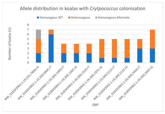 Distribution of SNP alleles in colonized koala group. Blue: Homozygous wild-type allele (WT). Orange: Heterozygous allele. Grey: Homozygous alternate allele. NW_018343963.1:19,355,780G > A(p.S23S) (n = 7), NW_018343963.1:19,369,090C > T(intron) (n = 7), NW_018343963.1:19,369,149G > T(intron) (n = 4), NW_018343963.1:19,369,150C > A(intron) (n = 4), NW_018343963.1:19,369,152C > T(intron) (n = 4), NW_018343963.1:19,369,197C > G(p.K317N) (n = 5), NW_018343963.1:19,369,211C > T(p.A313T) (n = 5), NW_018343963.1:19,369,212C > A(p.E312N) (n = 5), NW_018343963.1:19,369,244A > T(p.F302I) (n = 5), NW_018343963.1:19,369,260T > G(p.E296H) (n = 7).